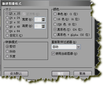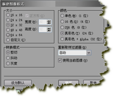 来新建图片格式,这时弹出窗口,选择“真彩色”和“32”点确定,另外再新建一个“真彩色”和“16”,点确定,如图