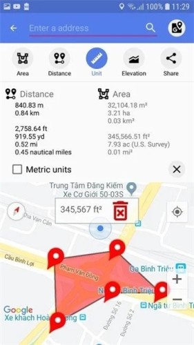 搜索任何地址或坐标到测量区域。区域计算器app非常适合计算土地的高度。