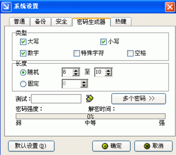 技巧: 您可以在这儿测试密码的强度. 点击生成密码按钮生成一个随机密码或直接在密码编辑框键入一个密码, 下面的密码强度栏将显示这个密码的强度及解密这个密码需要的时间(以一台每秒可以解密100万个密码的计算机为例). 强烈建议您将自己的密码设定为8个字符以上!