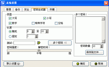 点击"多个密码"将显示下面的窗口,您可以设置生成密码的数量, 点击"生成密码"按钮将在右边的列表中自动生成指定数量且不重复的密码, 您可以点击"保存到文件..."按钮保存这些密码.