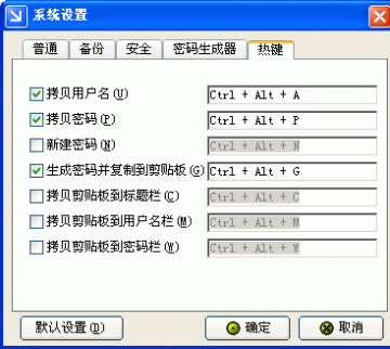 通过这儿, 您可以自定义系统热键实现: 剪贴用户名到当前窗口的编辑框, 剪贴密码到当前窗口的编辑框, 新建密码, 生成随机密码到当前窗口的编辑框等功能.