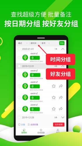 微信语音转发助手可以支持按照不同用户进行语音分组,实现快速管理某人发送的语音信息,还可以按照日期进行筛选,找到某时间段好友的语音进行管理,支持合成后的语音进行删除,支持多账号下的微信语音管理。