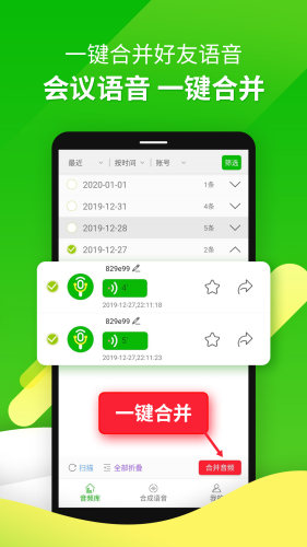 微信语音转发助手app,全新微信语音转发工具,能够轻松合成、转发聊天消息内的语音文件,使用简单,选择你想要的语音文件进行合并,轻松转发,方便又快捷。