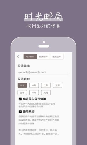 我们支持电子信件、纸质信件、地点信件三种方式,收信的时间,你可以设置成半年、一年或者若干年后,也许未来的某一天,这封信将成为你的宝藏。