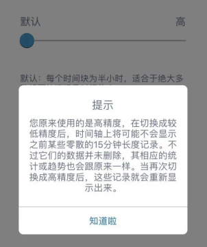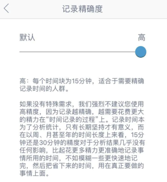 记录精确度从30min切换到15min,下方会有文字提醒,“记录越精确,越需要花费更大的精力在时间记录的过程上”。