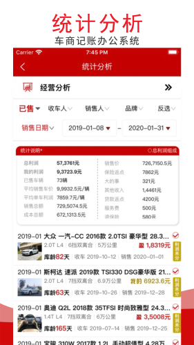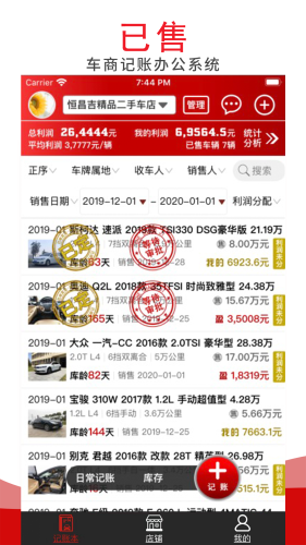 "车商记"专注于服务帮助二手车商提高财务管理及办公效率;帮助二手车商在收车、整备、销售过程中实现随时随地记账、查账、历史数据一键统计分析;