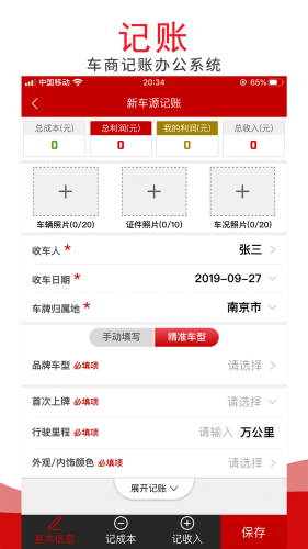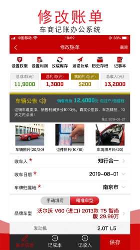 实现合伙人之间财务公开透明、实时共享和永久保留修改记录等记账功能(其中包括"个人车源账本""合伙车源账本""员工账本""养猪车源记账""店铺账本"等功能,专为车商倾力打造)。