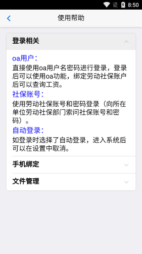 直接使用oa用户名密码进行登录,登录后可以使用oa功能,绑定劳动社保账户后可以查询工资。