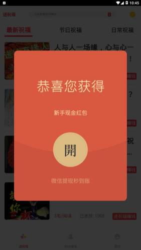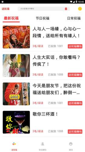 送祝福赚钱app是一款转发阅读赚钱平台,平台拥有丰富的新闻资讯内容,用户通过阅读转发即可获取现金收益,单价高,提现迅速,喜欢手赚的朋友可以前来下载使用。