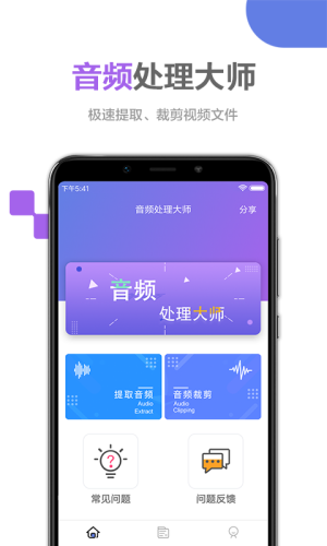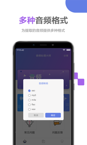 - 音频提取,音频处理大师可以快速的提取出视频中的声音部分并转换为多种格式的音频文件。