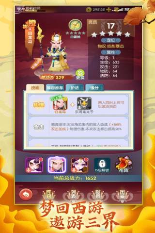 2、在游戏中玩家需要寻找招募人、妖、仙三族中知名的伙伴,组建强大的阵容,并加以排兵布阵应对各种闯关挑战。