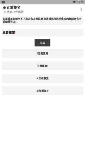 王者重复名生成器最新版,在线生成王者荣耀手游重复名称,使用简单,解决游戏昵称重复问题。下载最新可用王者荣耀重复名生成app,轻松生成游戏重复网名,方便又快捷。