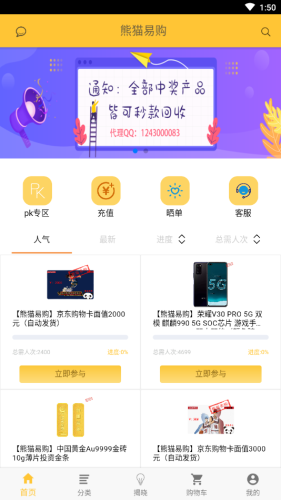 2、PK专区 提供了全网各大主流电商平台的购物卡,通过PK模式即可获得商品优惠购买权益。