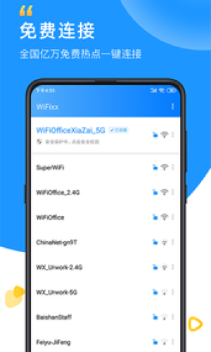 WiFixx app是一款手机wifi助手,软件拥有丰富的wifi热点,一键查询,一键连接,使用简单方便,可以帮助用户更好的手机上网,觉得不错的朋友可以前来下载使用。