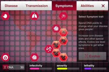 在瘟疫的传播过程中,玩家可以通过收集DNA来不断增强病原体的实力,例如增加空气传播、水体传播等传播方式,从而加速瘟疫在全球范围的扩散;又比如增强病原体对特定气候或药物的抗性。此外,玩家还能设定瘟疫症状的严重程度及明显程度——不严重、不明显的症状有助于瘟疫在人类不知不觉间大范围扩散,但是这种相对“温和”的瘟疫又比较容易被治愈。总之,这场瘟疫不能过于来势汹汹,也不能一直不温不火——至于到底什么“火候”最合适,那就得由玩家自己摸索啦。