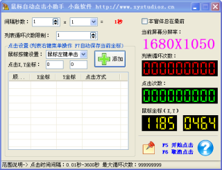 鼠标自动点击小助手可设置鼠标点击频率、点击次数、点击坐标及鼠标点击方式,几点非常能够精准,其用途广泛,可用于点击广告等。