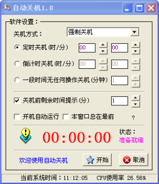 小炎自动关机软件拥有强制关机、重新启动和注销系统三种关机模式,另有还拥有定时关机、倒计时关机和一段时间无人操作关机三种启动方式。