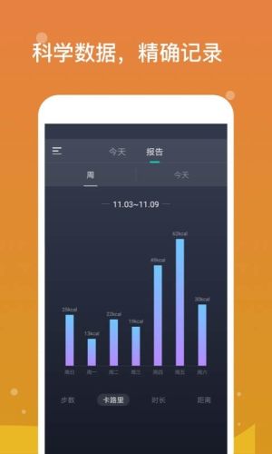 2、专业计步支持根据身体信息、性别信息和步数计算出以小时、自然日和自然周为时间维度下,消耗的卡路里数据,行走距离和行走时长的数据,并通过柱状图的形式,清晰准确的展示给用户