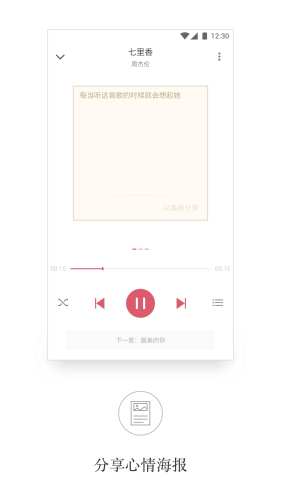 记录心情,用户可以打开播放器直接记录心情,同时还可以以海报分享到朋友圈;