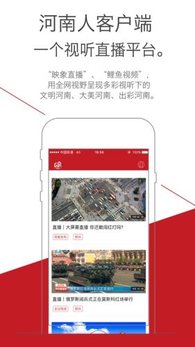 河南人客户端,是一个试听直播平台。“映象直播”、“鲤鱼视频”,用全网视野呈现多彩试听下的文明河南、大美河南、出彩河南。