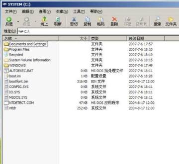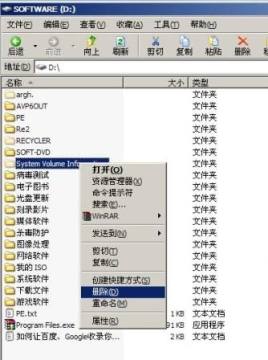 1.对硬盘所有分区的大部分文件随意进行操作。看图就知道了。在PE下,是直接显示“系统隐藏文件”的,不需要你再手动去显示。看到下面那个文件夹了吧?在XP下,你肯定是删除不了,在PE下,干掉它吧!其他操作,我就不说了,和XP下的操作完全一样,右键-复制,粘贴,搜索什么的。。。。。应该都会吧?