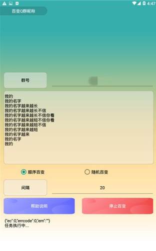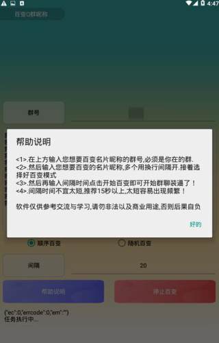 百变Q群昵称app,手机QQ群昵称自动替换工具,让你在群聊天时能够快速修改群昵称,全自动修改,方便快捷,让群聊天更有趣,聊天装逼必备神器。