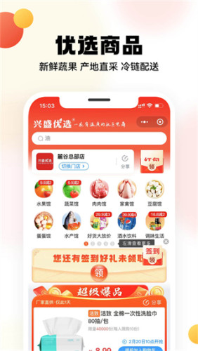 兴盛优选app是湖南社区买菜的全新平台,这里有最全的日常食材用品可以选购,种类多,价格亲民,相比于一般的在线买菜平台,芙蓉兴盛优选能够当天取货,非常快速。