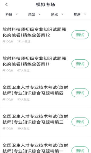 放射医学师题库APP有模拟考场、历年真题练习、每日一练、快速练习、考点练习、考试押题、做题记录等多种学习与做题模式、丰富多样化的陪你一起准备放射医学师考试。