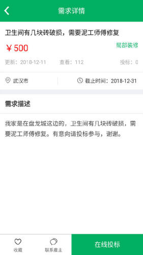 例如:家里有几块磁砖破损需要更换、墙面开裂需要油工修复、水管破裂、马桶堵塞、灯具安装等等,这些都可以发布在凤巢需求大厅里。