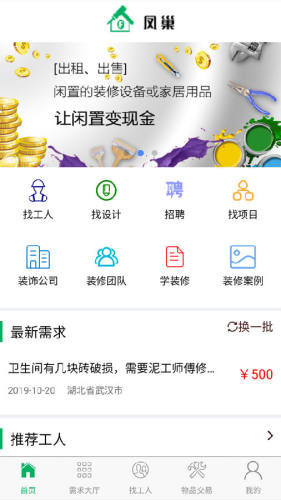 凤巢APP提供的服务功能有:装修需求大厅、物品租售、找装修工人及设计师、找装修团队、找装修公司、装修项目转包等,