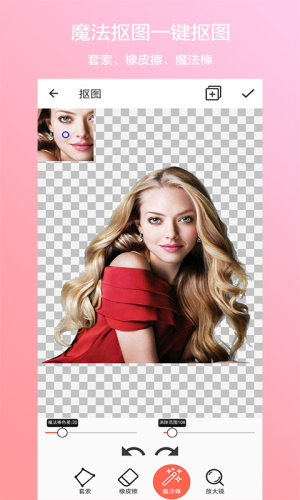 3、魔法抠图功能中包含抠取、擦除、填补、放大工具;