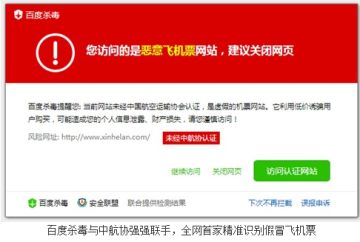 除了自动拦截虚假、欺诈、挂马网址,让用户实现网购零风险,百度杀毒网购防护版也面对即将到来的春运、旅行高峰,推出了全网首家精准识别假冒飞机票的功能设计。安装百度杀毒网购防护版后,用户无论使用何种浏览器,都能精准识别出虚假机票、仿冒官网,而在对虚假机票网站一网打尽的同时,此款安全软件也对风险还进行了等级分类,全面做到安全网址免打扰的不骚扰。