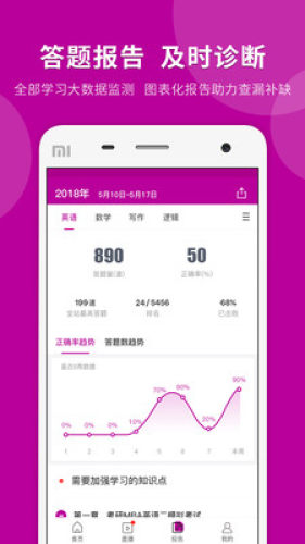 每次作题,系统都详细记录,自动生成答题报告,答错量、正确率、全站答题排名、正确率趋势、错误率趋势一目了然,需要加强的知识点,系统自动推荐