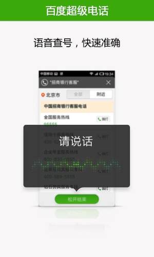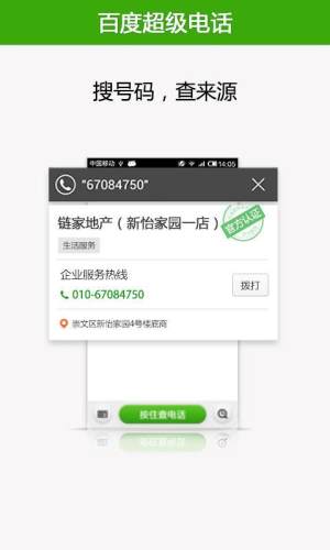 百度超级电话能够通过语音查询电话号码,使用百度超级电话能够快速查找所有收藏在黄页内的号码,绝对真实可靠,另外经过百度超级电话收录的号码也能及时显示其身份。