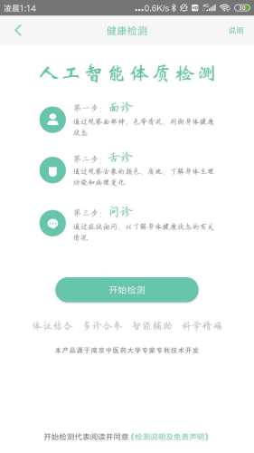 健康检测是依据黄帝内经中运气学说和中医体质分类的国家标准研发,采用人工智能技术对用户的面象和舌象做分析,并结合问诊,得到用户的体质报告,给用户养生提供指导。