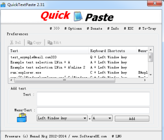快速插入预定义文本工具(QuickTextPaste)是一款小巧型便携式工具,可以在Windows任何程序中快速插入粘贴预定义文本内容,程序通过快捷键操作,方便用户节省时间,减少内容输入错误等问题。