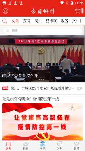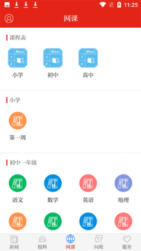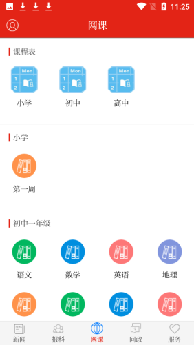 2、用户打开今日郴州app后,进入首页,在最底下的菜单栏点击“网课”进入页面,点击对应年级课程观看。