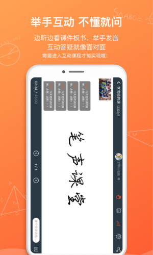 师生之间看得见,视频语音文字实时沟通。 支持板书讲解、举手发言、在线测验,线上还原真实课堂。
