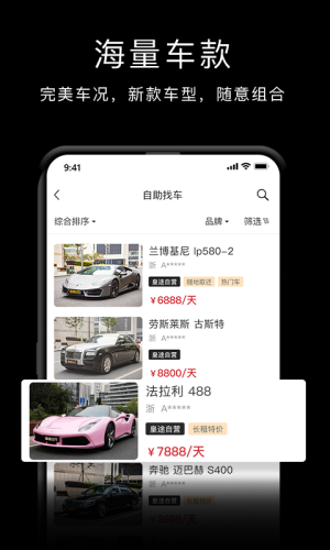 主营品牌包括:法拉利。兰博基尼,劳斯莱斯,宾利,保时捷,玛莎拉蒂,奔驰,路虎等。