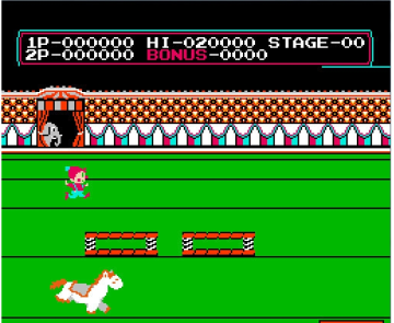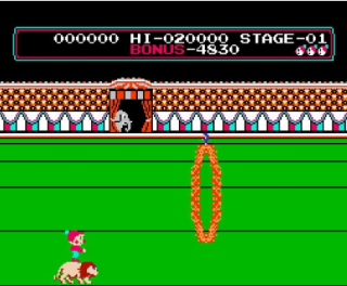 马戏团画面虽然在当时也称不上华丽,却具有很高的趣味性。在游戏中玩家需要操纵这只小丑,通过五个关卡的考验。这些关卡都是大众在马戏团里耳熟能详的,比如跳火圈,空中飞人等等。当然游戏肯定不会像现实中去跳火圈那么难,平易近人但却非常到位的操作为它赢得了很多玩家青睐。游戏真正要磨练的是玩家的手指,通过对十字键与A键跳跃的精确掌控,你将很快熟悉动作游戏的套路。