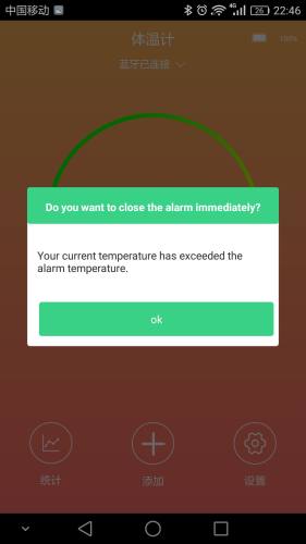 您可以设置您的报警温度,当超出您设置的报警温度是APP会一直提醒您(手机会一直响,直到您关闭报警为止)现在是在发泄,方便您及时采取退烧措施