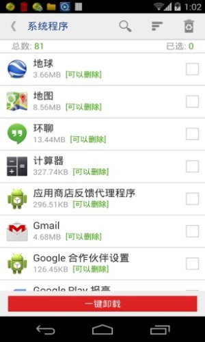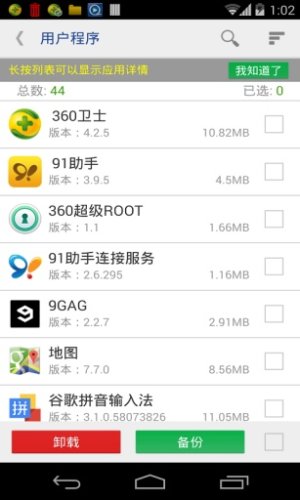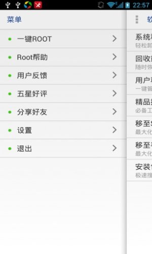 6.自带一键root功能7.区分系统软件和用户软件,简单方便