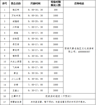 据杭州西湖风景名胜区管委会消息,5月1日前,西湖景区下属的岳王庙、黄龙洞、飞来峰、郭庄、三潭印月、钱王祠、木兰山茶园、城隍阁、玉皇山、万松书院、六和塔、虎跑、云栖、植物园、动物园、少儿公园等16处收费公园景点向境内外游客免费开放。