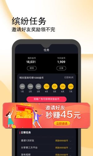 看视频得金币,邀新人得奖励,一个能刷出惊喜的宝藏APP。
