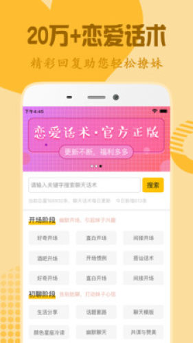 恋爱话术,这是一款可以帮你解决以上烦恼的App。不会聊,只需搜一搜,N+精彩回复供你选择。让您和女生聊天不再烦恼,更有专业导师帮您解答问题。