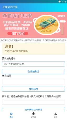 形象对话生成app,将文字转换为抽象表情进行聊天的实用工具,不仅能够将文字生成抽象话,还能还原抽象话到拼音,使用简单,轻松上手,让用户聊天更开心。