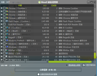Moo0 Disk Cleaner是一款强力的磁盘垃圾清理工具,可以清除磁盘上所有不需要的文件和数据,可以支持130多种清理对象,包括系统临时文件、注册表数据、浏览器缓存、历史记录和cookies(IE,Firefox和Opera)等等,操作简单,一键深度清理,还你一个干净的系统。