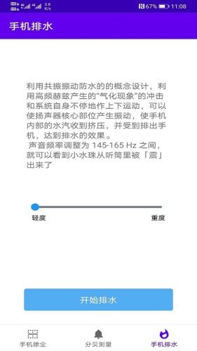 手机进水会影响手机的性能,对扬声器的损害更大。清灰APP利用声波震动的原理,调整至140-165HZ,可以将手机里的水震出来,不用拆手机就能解决手机进水的烦恼!