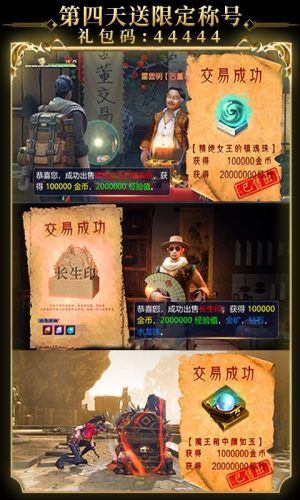 1.上线送VIP10(任务逐渐领取)还有1亿金币大礼包、限定称号大礼包、酷炫坐骑大礼包、极品鬼宠大礼包、绝版神器大礼包 五大免费礼包!!!
