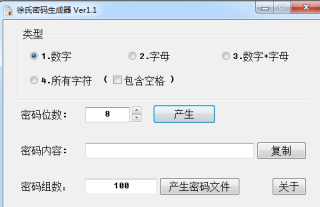 徐氏密码生成器是一款可以大批量生成随机密码的生成工具,当用户不知道要设置什么密码的时候,可以让软件帮你随机生成一个,当需要大量不同的密码的时候,也可以使用这个工具帮你批量生成密码,所有的密码类型、长度用户都可以随机生成。